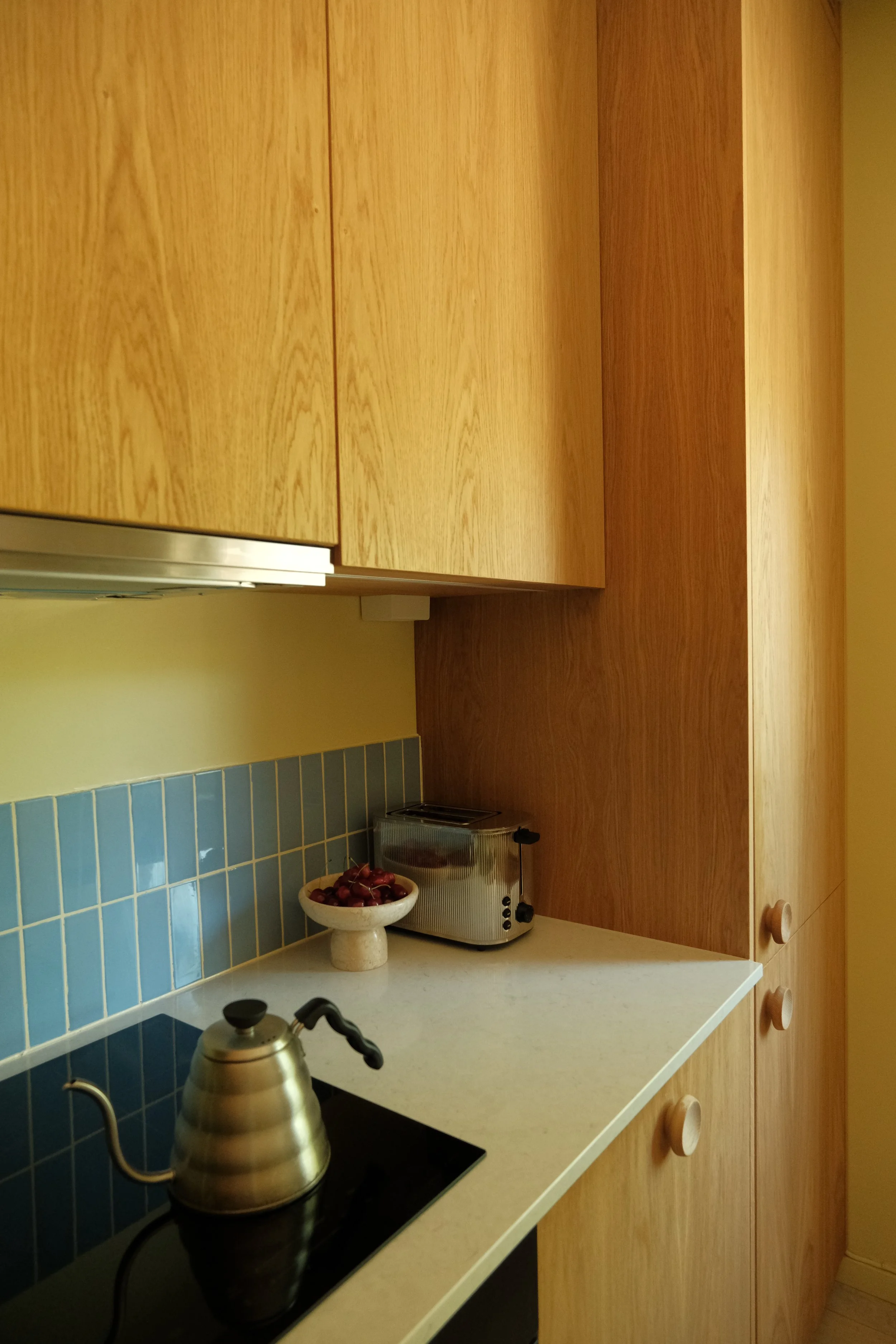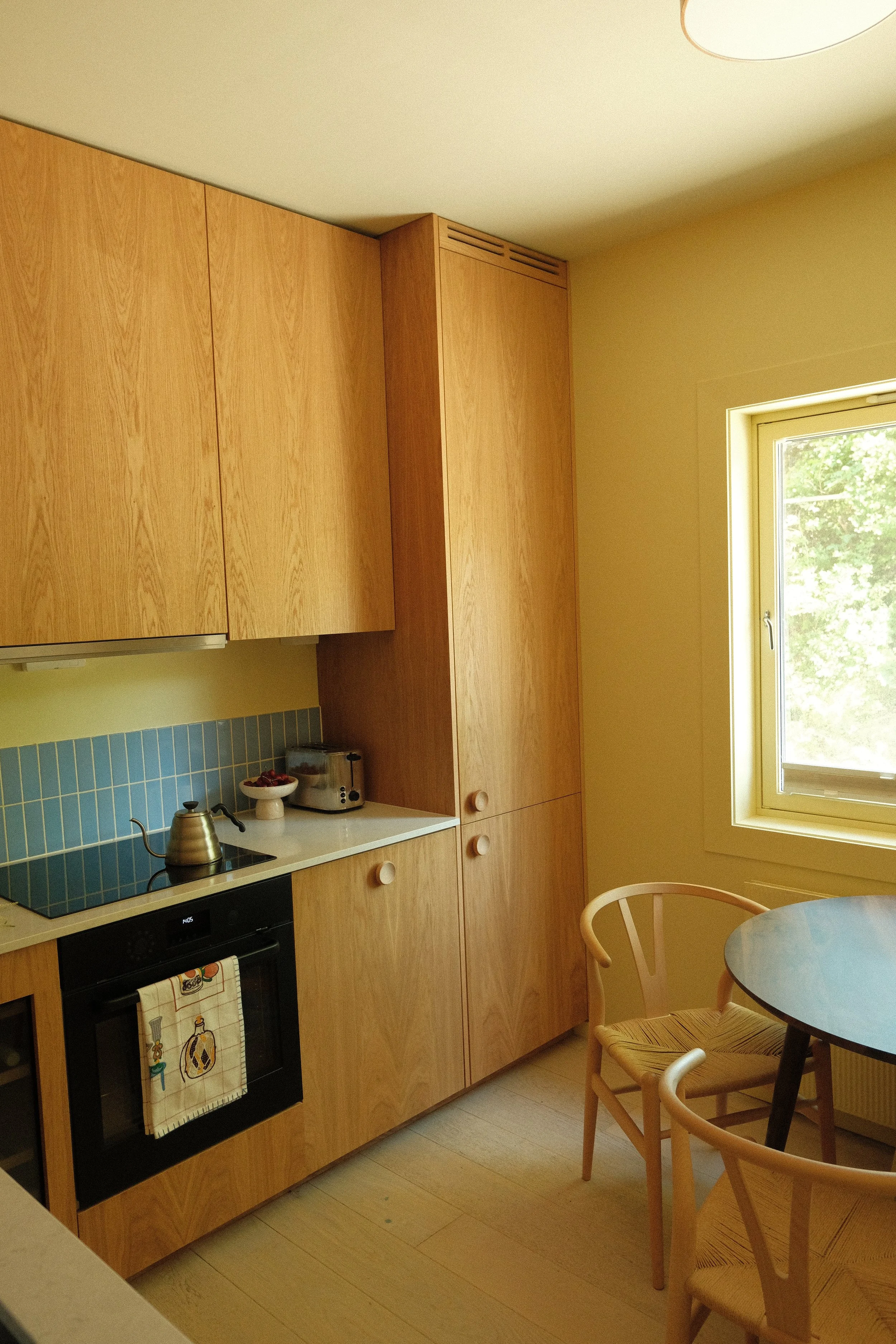 Fra å være et rom hvor man kun kokkelerte, til å bli et godt sted å ta morgenkaffen☕️ Få kvadrat ble ingen hindring for å få på plass et integrert vinskap etter kundens ønske. Materialkonsept og spesialtegnet kjøkken utarbeidet av oss.